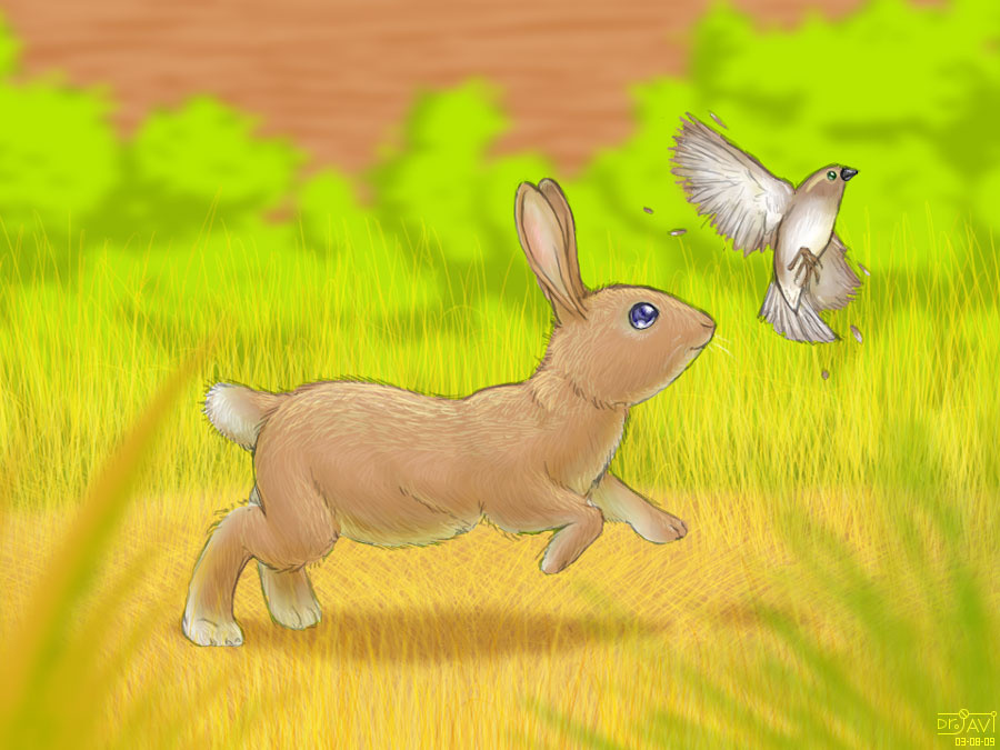 We saw this yesterday from our window. The wild bunnies that live behind my house were playing, chasing the sparrows. It was hyperglycemically cute.