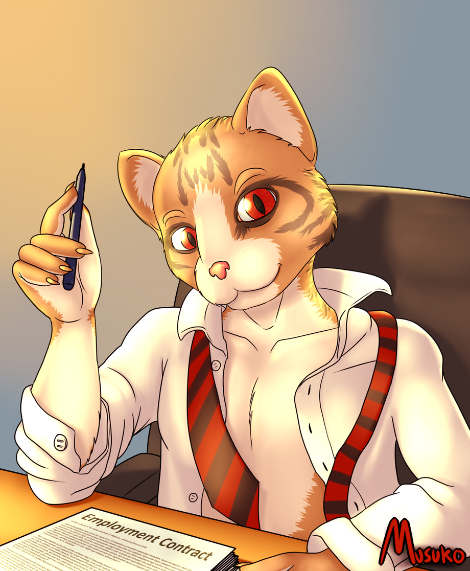 More art practice. Musuko sat at his desk with a contract ready. Will you sign?