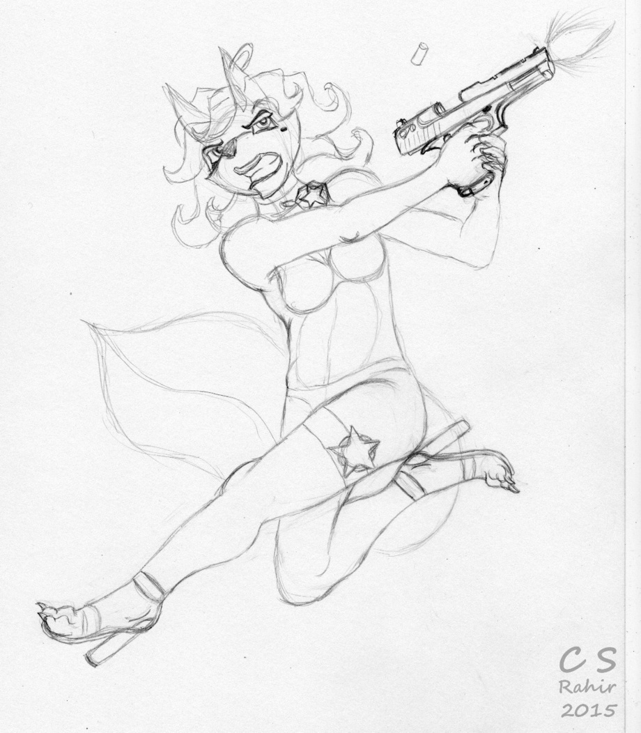 I will refine and color it tomorrow, and also try to come up for a reason why she's apparently on a dangerous mission for which she had to wear nothing but lingerie and high-heels. At least she found a place for that police badge ;-)