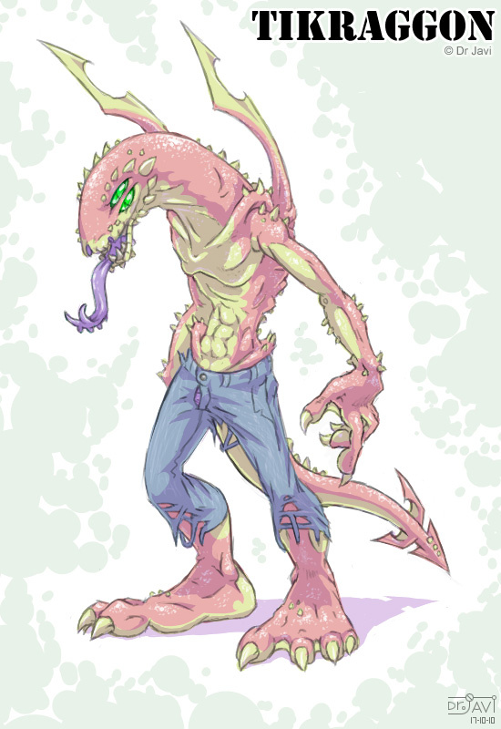 The tikraggon are usually harmless, as they can only use corpses to learn and grow, but they can become fierce if the species they copy is so. On Earth, they won't attack humans - but some are known to rape. Due to their emulation process, sex between these creatures and humans is possible and reproductively effective - neither the process or the result are pleasant.