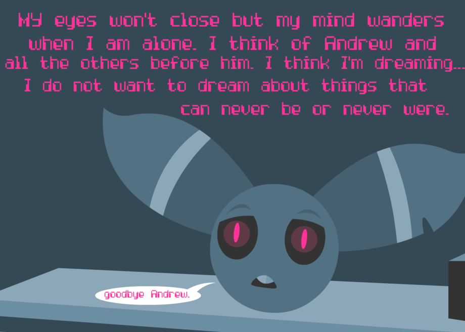 Also, I feel pretty bad for Eeple. Apparently, Eeple still persists in existing, though the former owner (Andrew Telly, someone that Eeple apparently really enjoyed the company of) is quite likely dead and gone, or at least far too old to really even take care of Eeple, and now has to put up with Josh. Eeple, in the end, just wants to delete those old memories, but apparently cannot.,