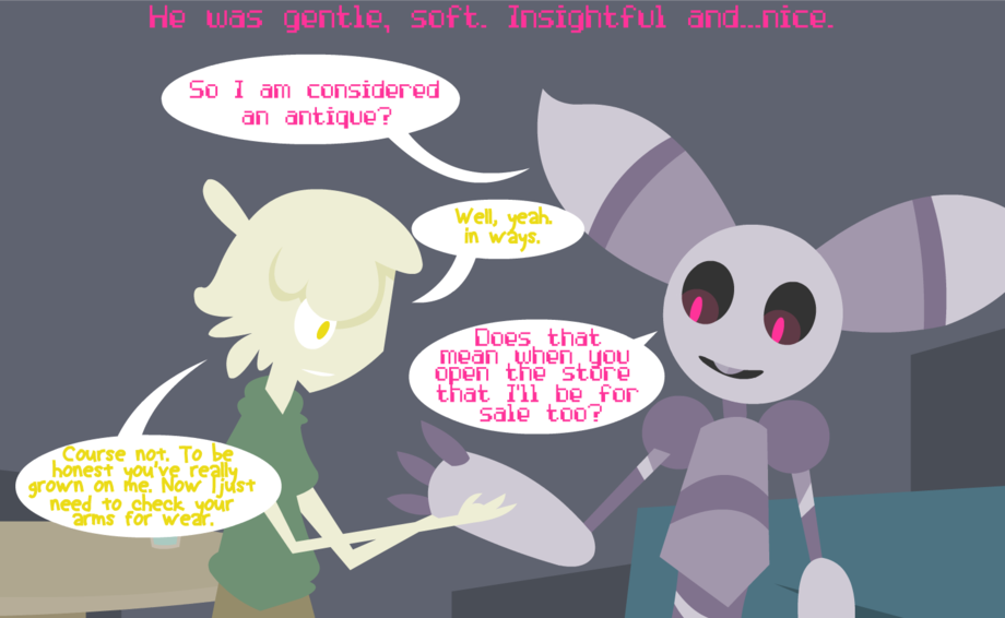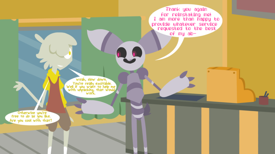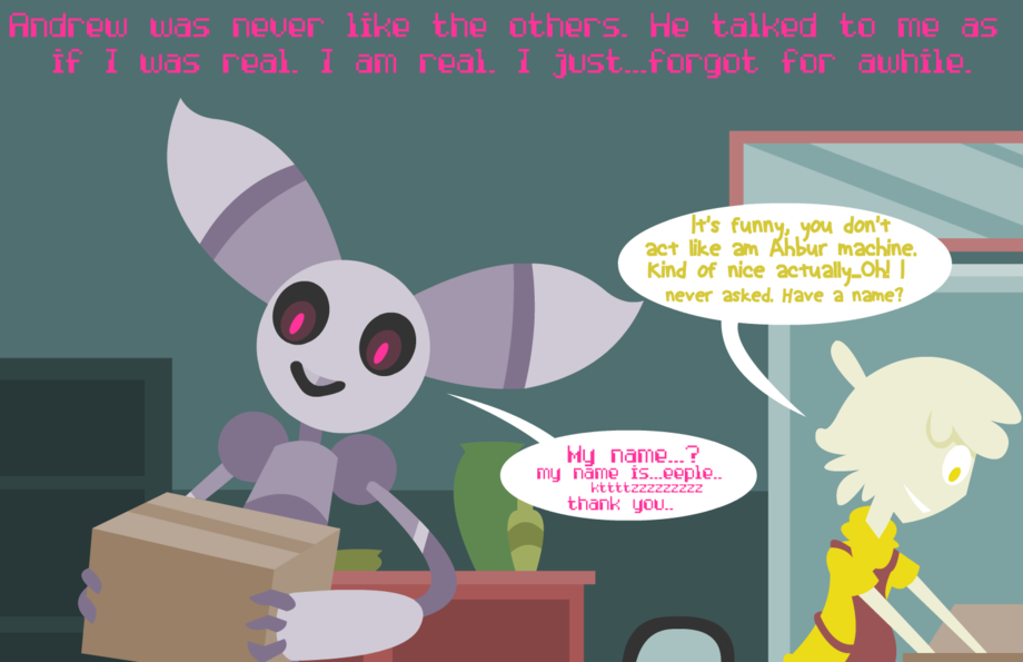 Also, I feel pretty bad for Eeple. Apparently, Eeple still persists in existing, though the former owner (Andrew Telly, someone that Eeple apparently really enjoyed the company of) is quite likely dead and gone, or at least far too old to really even take care of Eeple, and now has to put up with Josh. Eeple, in the end, just wants to delete those old memories, but apparently cannot.,