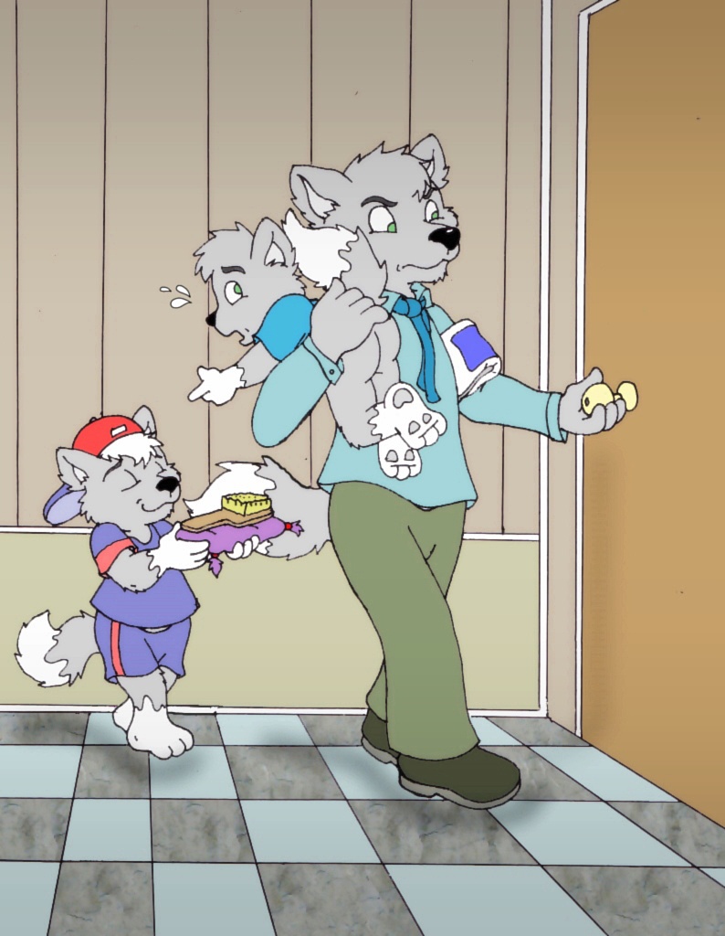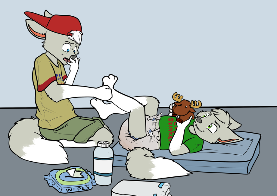 Monday at the Sunnyside Daycare was just not a good day for young Caiden. Coming off of a weekend high of good behavior, extra playtime, and even being able to wear Pull-Ups had to come crashing down sometime. The morning started out rather well with Caiden showing off his super-big-kid Pull-ups to his (mostly) potty trained class. That in and of itself was innocent enough. What wasn't was when Caiden (and maybe his best friend Dex) decided that sharing toys were beneath them and took some toys that some smaller girls were already playing with. That didn't end well for Caiden (or Dex :) ) as they both landed themselves in time-out. Later at recess Caiden decided that instead of playing just tag or hide-an-seek he'd rather play throw-a-rock-at-other-classmates-like-their-alien-invaders. That of course wasn't going to fly so Caiden lost his recess privilege and was going to have a note sent home to his parents on his behavior. If that wasn't ammo enough for a stern lecture and fanny warming when he got home, Caiden (and Dex again) got caught fighting other cubs at naptime and using foul language. That got both toddlers sent to the principals office for a stern talking to and both were sent home. Mr. Trevor (Dex's dad) picked the boys up since Caiden's parents were out and about at the time. Trevor took the boys to his house, as him and the Smith's are neighbors, and brought them inside for a lecture and spanking from him for acting up in school. A few hours later Cheryl came by to pick up Caiden and brought him back home. She sat his little butt in the corner until Mike came home to deal with him. As soon as Mike arrived, he was filled in with what happened at school by Cheryl. Mike then took Caiden's clean Pull-Up off and threw it away and grabbed a fresh diaper instead. Mike informed Caiden that since he can't seem to act like a big boy then he will be treated like a little boy, diapers and all. Mike then carried the diaper-less toddler down the hall to the nursery to 'remind' Caiden on how to behave at school. Kyle had heard what was going on through his mother and decided to help his father out by grabbing the furbrush and bringing it to him to Caiden's dismay.