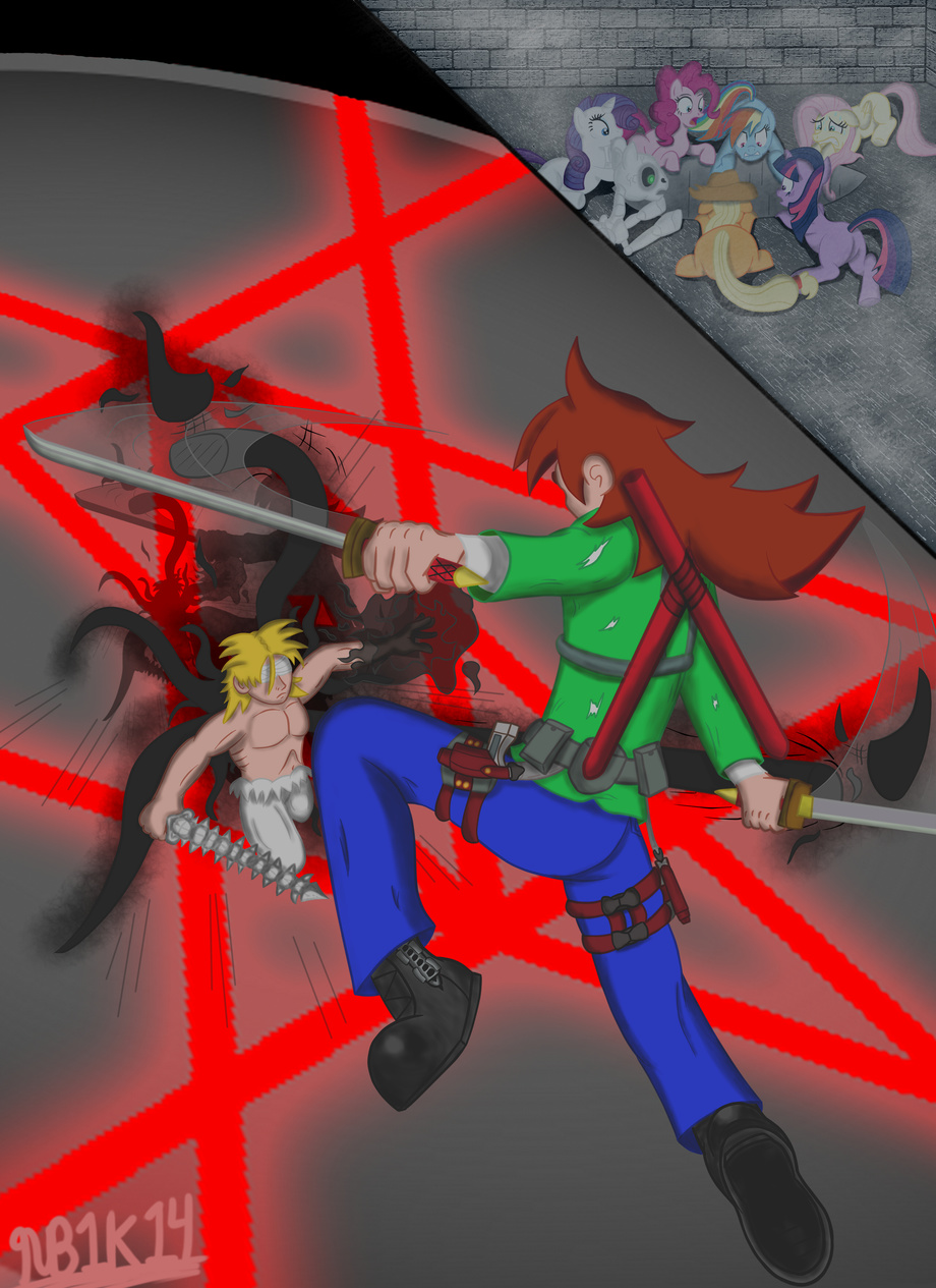 "The ponies could see the two brothers locked in an intense retaliation from below. There was no sudden pause to each attack, as they just kept exchanging moves instantly and uncontrollably. They have never witnessed, or even dreamed of seeing such an intense concentrated battle in their lives. Each and every pony cheered and rooted for Jack to land a blow on Jared. They were so excited to see such action, but at the same time, they felt scared and bewildered. Back down, both of their flurry attacks were so quick that it was impossible to even make out for the mortal eyes to follow. Jared kept on the defensive, while sending his miniature tendrils to do his bidding. And Jack went all out on the offensive, as he kept his eyes sight on his brother and taking out the incoming tendrils."