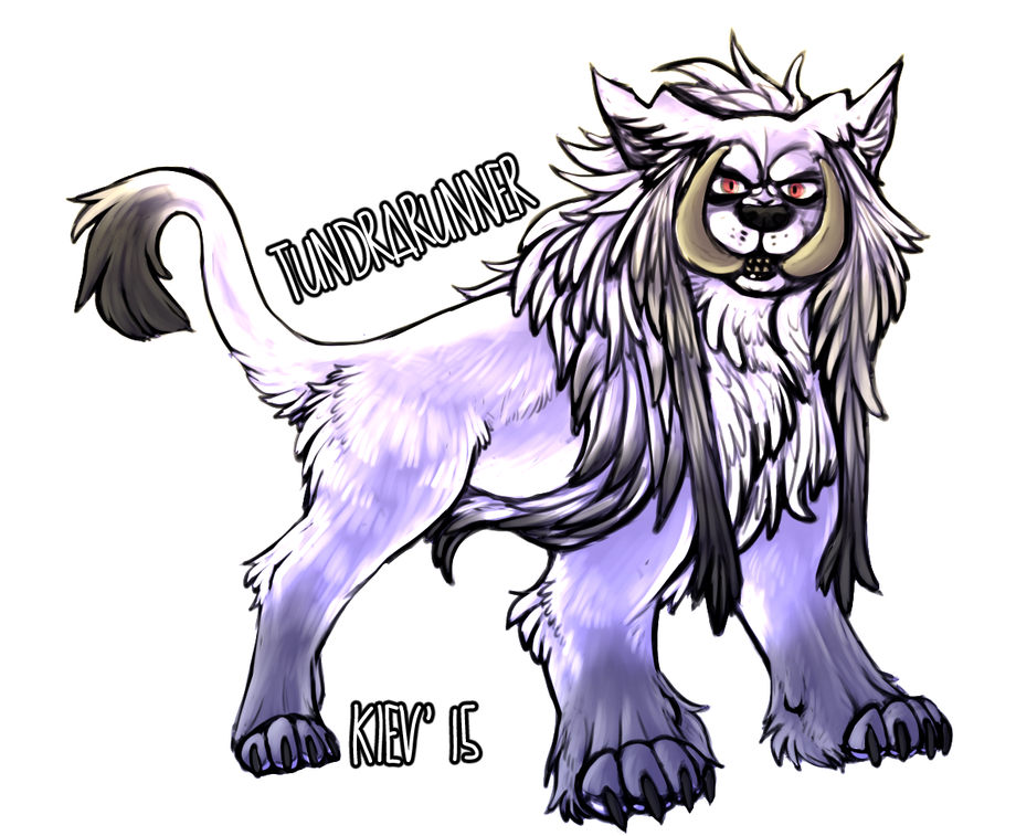 tundrarunners are colored white or light gray, with darker gray and black markings, and red, orange or yellow eyes. naturally they hunt in packs, which works well with the northern hunting techniques. they run incredibly fast in short bursts, like cheetahs, but cant hold their speed over long distances. they have long, thick fur for keeping warm in their cold habitat, and large paws for helping them walk in the snow. theyre strict carnivores, eating anything other than meat will cause them to become sick.
