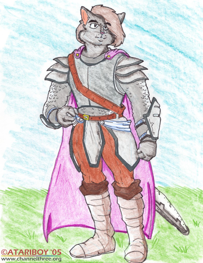 "This is a joke based on Advanced Dungeons & Dragons (the older Gary Gygax version of the game had "Basic" and "Intermediate" versions) ... both Angus and Sir Kain are fighter types, with 18 strength (highest possible in the game for regular characters)... they are also both short, and have black fur, so I figured they would look cute together. "