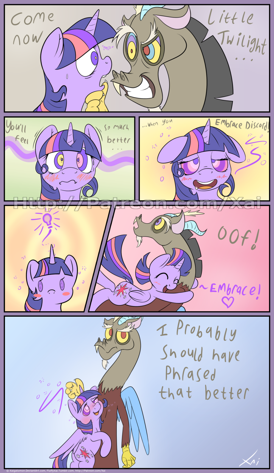 I think Discord had to learn the same lesson Fluttershy did... be careful how you word things with hypnosis xD Well fluttershy's case was a little different... oh well