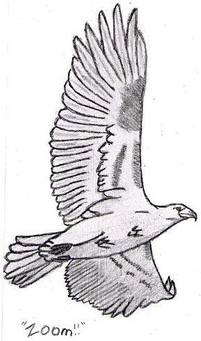 a doodle of a young bald eagle flying, on a 3x5 blank note card, the scanner ate some of the detailing.