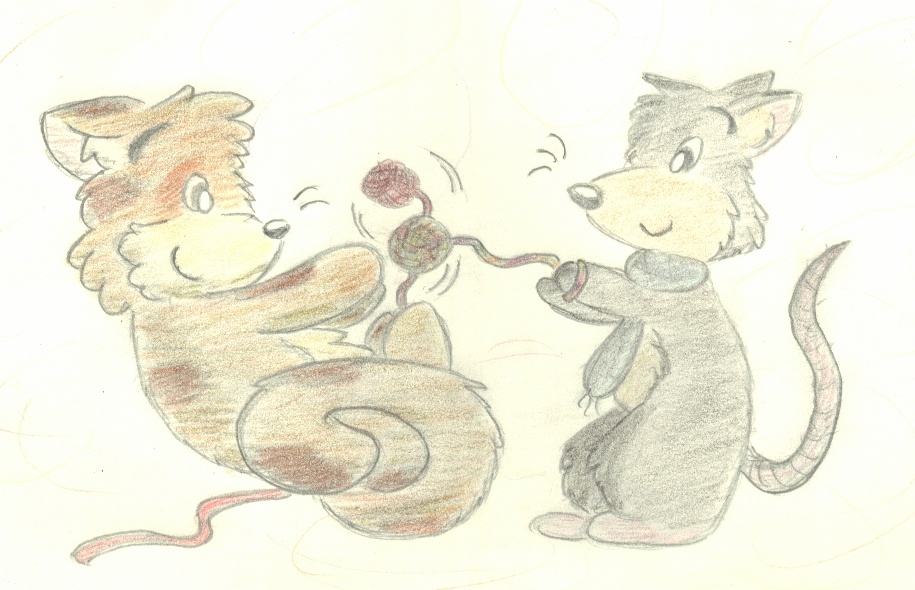 It's a cat and a rat playing with yarn.