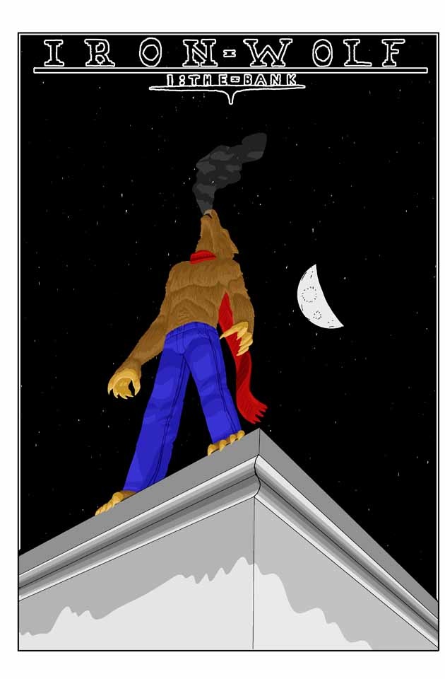 Here is the cover page for issue 1, The Bank. Iron wolf howls from the roof of the bank, frustrated at having searched through the whole city and not finding his prey.