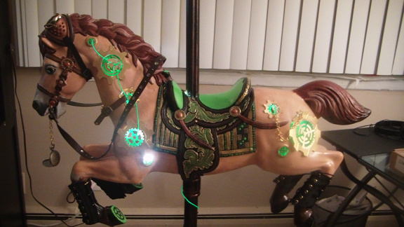 Another custom carousel-lamp horse from Liz- Steamcatcher will be trotting along with us to Anthrocon, come check him out in the art room! Complete with LED lights and Electro-luminescent wire. http://vividstuff.blogspot.com/2015/06/between-pages-a...