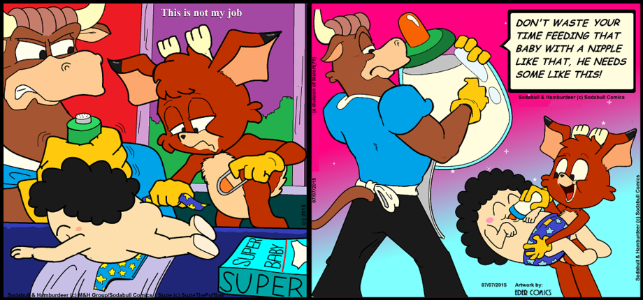Sodabull and Hamburdeer trying for first time to change a diaper.
