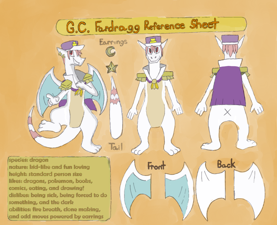 G.C. Fardragg is a dragon that can breathe fire and make clones of himself using his earrings, which are actually relics that can enable some odd powers. He is a biped but because of his shape he can walk on all fours too. He mostly prefers being biped though.