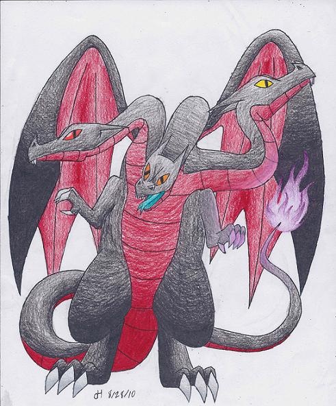 Charberus is very large for his species and was mutated by the trandformation from Pokemon to Shadow Pokemon in a way that gave him his abnormal size, an unnecessarily long tail, huge wings, and two extra heads, as well as slightly abnormal patterns on the scales.