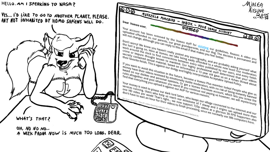 The drawn version of https://inkbunny.net/journalview.php?id=187066 This had multiple purposes: An excuse for me to draw again, vent art about human stupidity, and a warning for other artists to avoid posting their stuff to Vimeo unless they're looking to get trolled. Our protagonist is once again the naughty red vixen which I seriously need to name sometime.