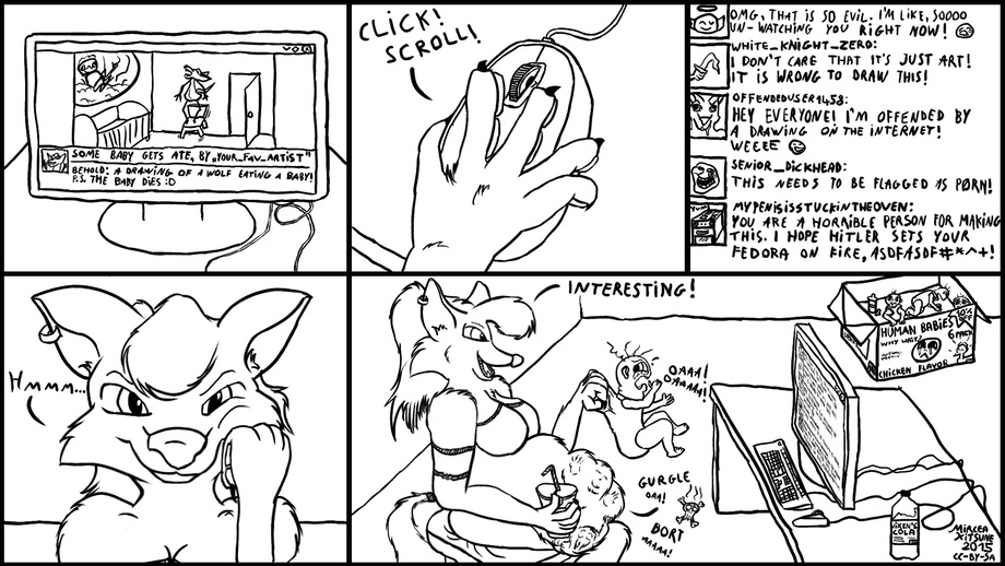 My image response to https://www.furaffinity.net/view/17029845 and more precisely the comments posted there by users. If you want to complain about what artists choose to draw and post in their own gallery, at least have something worth complaining about! The hate comments will be awaited with love.