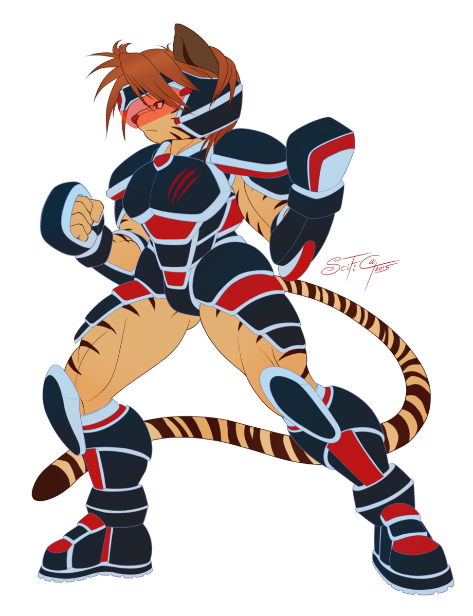 Claude's fighting style specializes in close quarter combat (CQC) due to his massive strength and enhanced healing factor, since he has no special mobility power his tactics boil down to full frontal attack. This armor is mainly designed to protect vital area while leaving extremities exposed to not hinder movement. This is a no nonsense design, very much like Claude's character. This design has no ambiguity to it, meant to take damage and to deliver it. It features heavy armor plating and specialized armored "Cestus" gloves to deliver heavy close range damage to opponents to enhance the already damaging punches Claude's fists deliver.