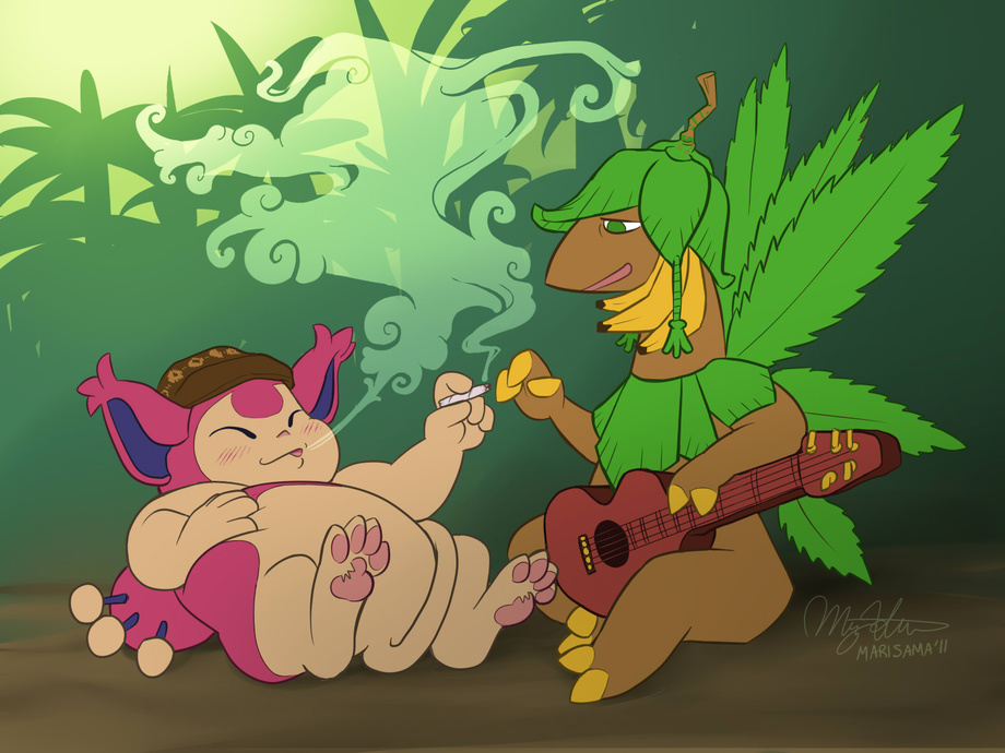 Just a Skitty and a Tropius hanging out behind some tall grass, passin the time. lolol This was inspired by a joke that me and Keet have about how Tropius is a stoner pokemon. He's a grass type, he carries food under his chin just in case he gets the munchies, and he's completely retarded: A banana dinosaur! Its so perfect.
