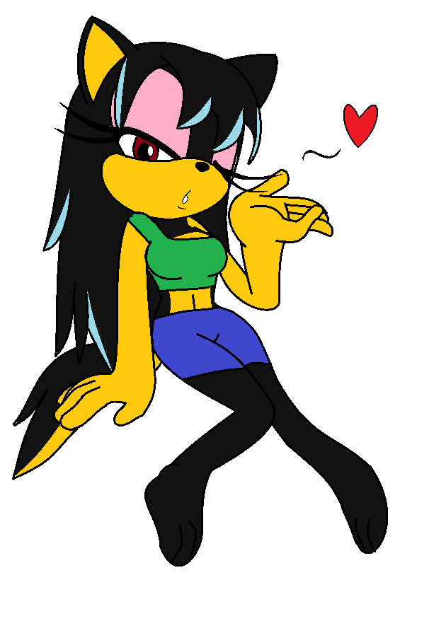 Her fur is black, her belly and muzzle is gold, her eyelings are pink and her hair has light gray stripes