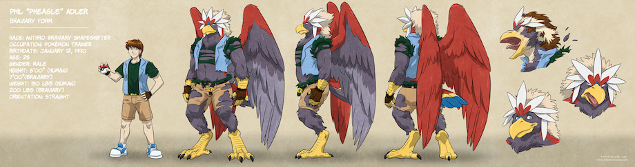 Braviary: Anthro with 2 pairs of talons, and 1 pair of wings on his back. About a foot taller than his human form.
