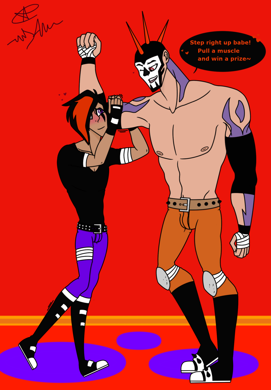 they wanted a drawing of Fistrick shirtless, and Corvo blushing as he squeezes Fistrick's bicep, which Fistrick is flexing.