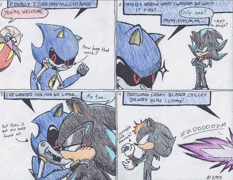 But no srsly why doesn't Metal have a mouth? He looks so incredibly RAPE this way, doesn't he? Urgh he needs to have a mouth so he can eat chilli dogs (and maybe do a few things to 266's chilli dog, hurr hurr). How much would it suck to be exactly like Sonic, including likes and dislikes, and NOT be able to eat chilli dogs? Cereal.