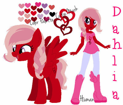 The last one i adopted from Kikai-kumo in dA Art made by kikai bases belong to owner Name: Dahlia Nickname: None Age: 15 Gender: Female Sexual Orientation: Straight Pony Type: Pegasus Cutie Mark: interlinked hearts Parents: Unknown Sibling(s): Unknown Children: None Special Somepony: None Occupation: Cupid in training