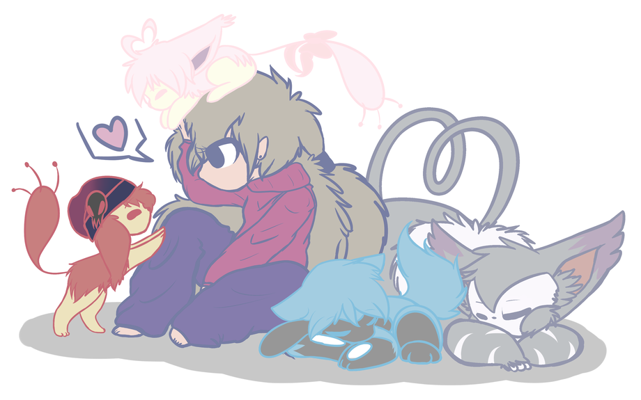 originally this was going to be a pic of me sitting on my bed beside my window, but before I started on the background, I thought it would be cool to put my my shiny skitty character into it, and them I decided to go overboard and put Bailey, Theodore, and Blade into the pic as well I was a bit lazy and didn't make the background, so now I have this thing. meh, I still like it.