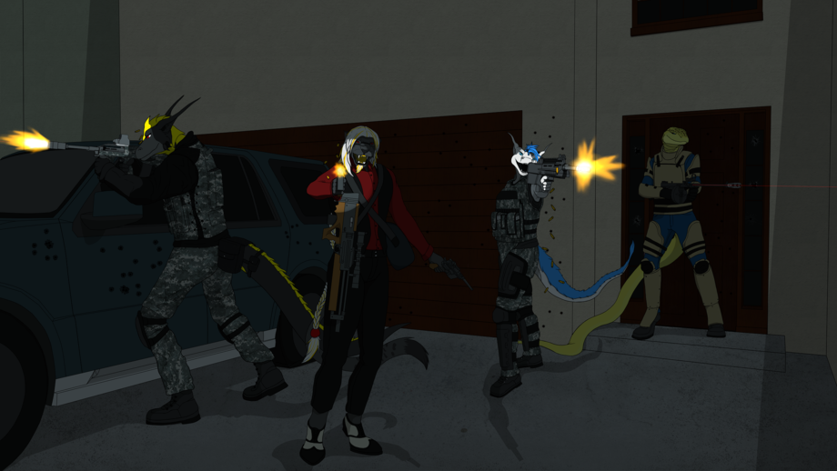 Arthemis and Zhet stepped out of their car and readied there weapons. Zhet stepped closer and spoke, “Drayden Security? You got the package?” The silence broke but it quickly returned as the tall male dragon looked over to his partner and growled something to her. She stepped around the back and the male dragon returned his stare to the panther and snake. For a split second however it seemed he was looking at the building behind Zhet and Arthemis. He seemed stressed now. Nervous. Zhet didn’t like that one bit. “You have the money?” asked the dragon. Arthemis displayed the suitcase he had on his side. “How terribly cliché, don't you think?” snapped the dragon. The snake replied, “Well, we deemed it fitting for such a cliché meeting spot.” Ernesto laughed and Chris returned to the group and handed over a sealed package. “Here,” she stated and threw a sealed container and Arthemis threw the suitcase to the two dragons. “Well it looks like-“ Zhet was cut off as a shot rang out and impacted the ground a few inches from where they were standing. Arthemis threw the case in the car and rolled forward in one fluid motion. Zhet pulled out his two pistols from his side and was ready to shoot the traitorous dragons. However he noticed they weren’t the ones shooting at him. As if they knew the attackers were already here, the dragons were unloading a high volume of rounds into the building. The tall male dragon yelled at him with intensity and viciousness as he was reloading his rifle, “Hurry up and get over here unless you want a round in your ass.”