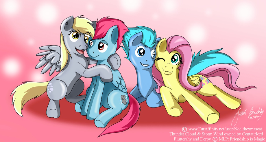 so here we have Derpy and Fluttershy having a snuggle with my two pegasi brothers Thundercloud and Storm Wind. so much dawww