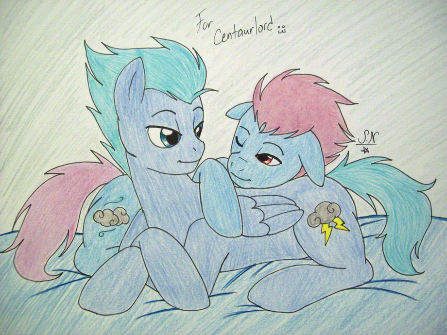 my pegasi brothers Storm Wind and Thunder Cloud. at a young age they were orphaned and thus only have each other, they do just about EVERYTHING together and are inseparable.