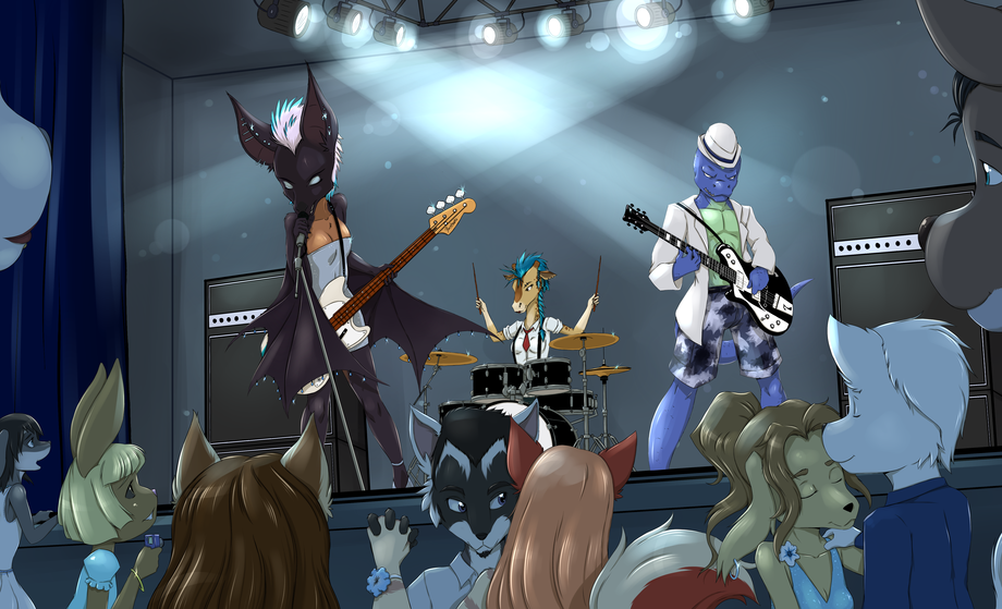 I love how much this picture captures: the band trying to look cool and intense even though they're playing for a bunch of highschoolers, the happy couple, the perhaps-less-happy couple, and the solo girls who hope to be as cool as the bat-guitarist someday.