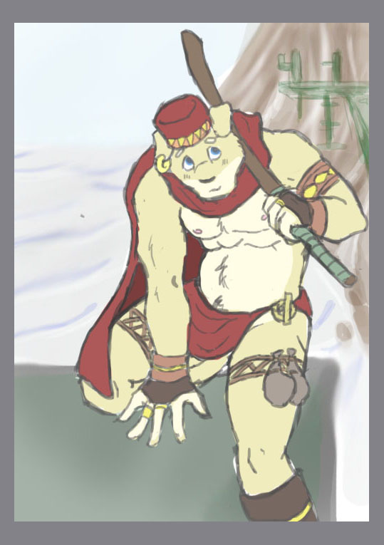 "Basically a ranger/guide who knows his way around the ruins. He's usually alone unless he has a job or needs to get to town so he doesn't bother to wear anything aside from his cape,loin cloth and hat. He wears red cause it's much easier to see in a distance (in the case of enemy attack, he can just rip it off quickly)