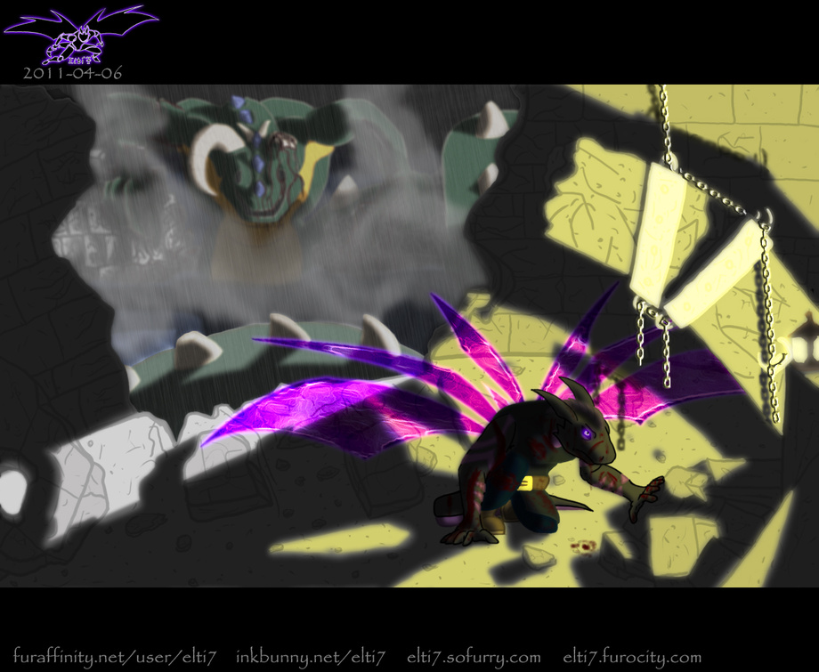 Ruthaa must face the four Archdemons, he need splitters of their gemstones. In a close combat Ruthaa cut the left horn off, but the Archdemon was laughing, he feels no pain. He seized the Dragon and throws him upwards, in this moment Ruthaa spread out his cursed wings and glides into a tower. Immediately the curse stated to rip the wings, for Ruthaa is that an awful pain. Every time he uses abilities of a Dragon the curse will keep it off.