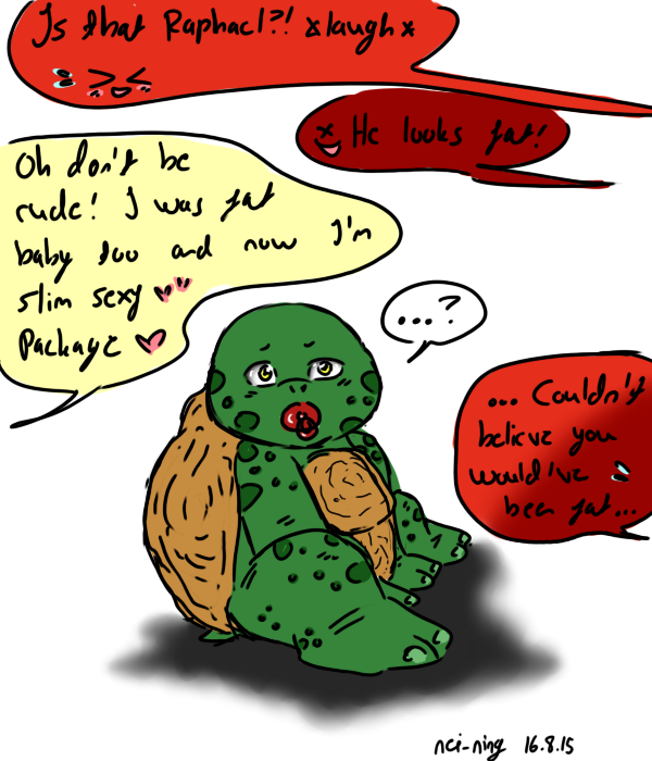 I made a comic in DA where Raphie (1987) and Raph (2003) turned into babies unlike Raphael (2014) so I made separate art about Raphael being a baby <3 Light red color -> Raphie Darker red - Raphael Yellow - Me (Nei-Ning)