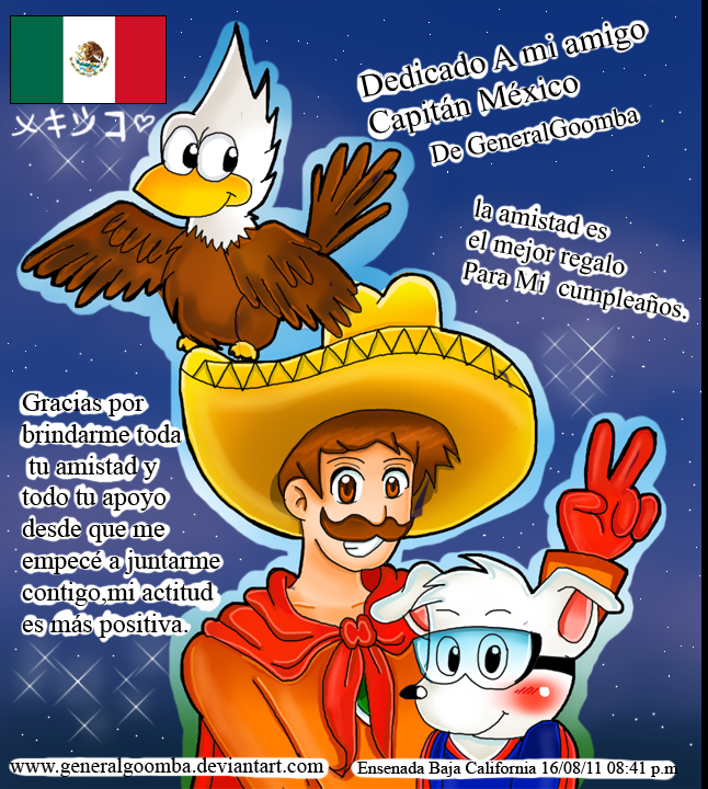 English: A cool gift done by a fan. My O.C. captain Mexico with his helpers: A dog an an eagle. ---------------- Español: Un fantastico dibujo hecho por una fan. My Personaje original: El Capitán México con sus ayudantes, un perro y un águila.