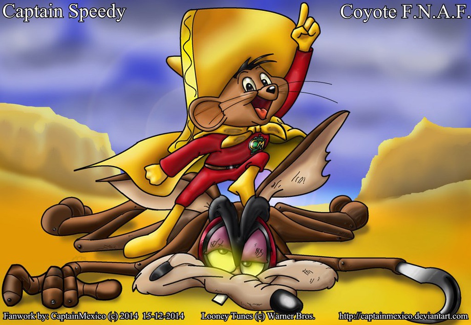 Speedy Gonzalez vistiendo el atuendo de mi Super héroe: Capitán México. Así que é decidió salvar a su tierra porque Foxy del juego F.N.A.F. está atacando a su pueblo usando un sucio truco: haciéndose pasar por bueno y por el Coyote este impostor, pero nadie puede engañar a Speedy ya que es muy listo y rápido para cualquiera descubriendo la verdadera cara y y ahora notando los tornillos flojos. El bien siempre triunfa sobre el mal.