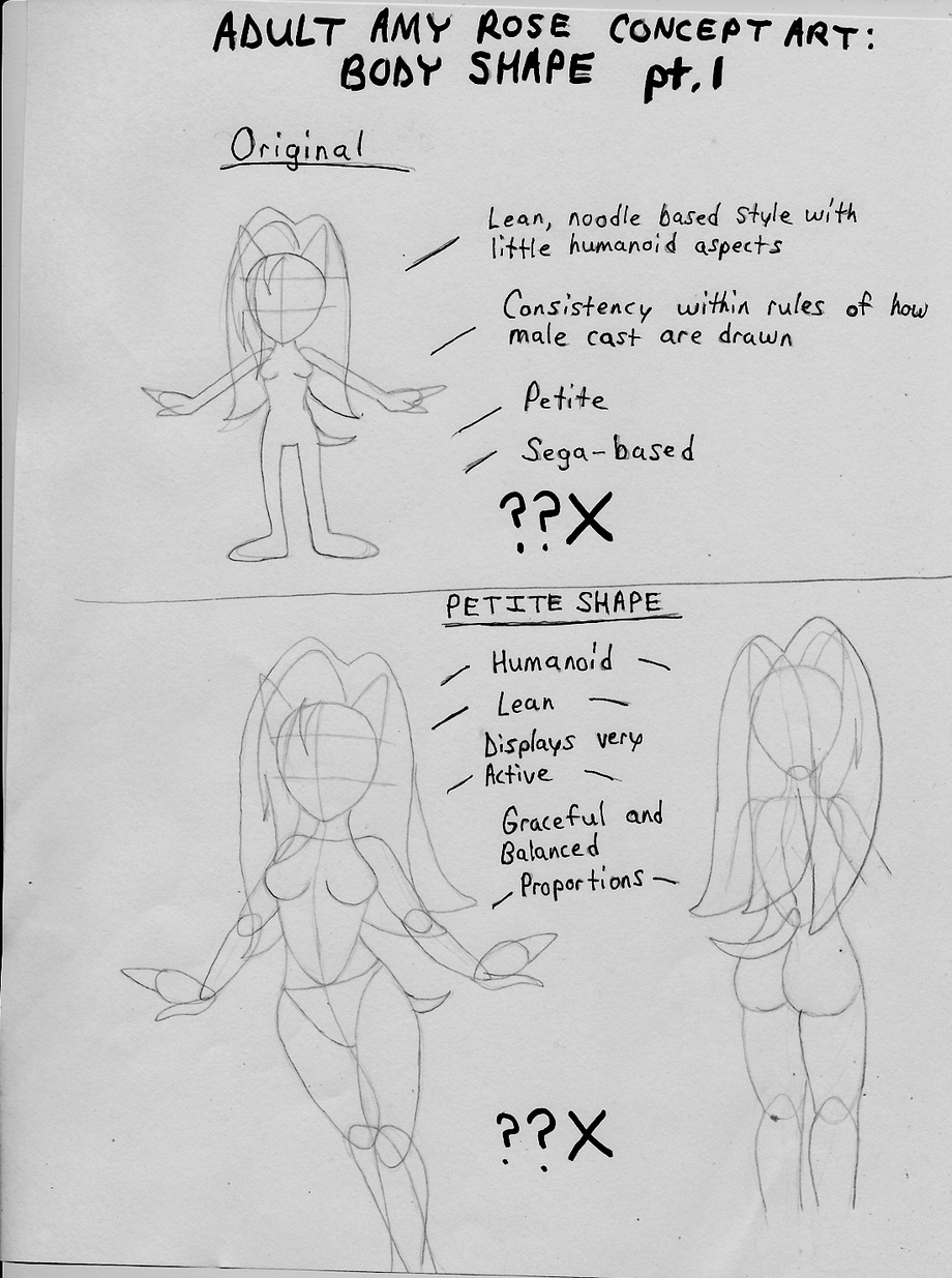 This is the final part of the process of adult Amy Rose. The idea of the petite shaped body was discarded because my mind thought about other aspects of Amy. She is adventurous and active, but she is also a young lady who enjoys the simple things in life. Since she lives in the city(Central City/Station Square) and her favorite food is soft-served ice cream, I imagine her also indulging in other sweets(cakes, pies, etc.) and hearty meals. It would make sense that naturally the weight of these rich foods be carried on her lower body rather than up top. The other aspect is Amy is the epitome of feminine and fully embraces it, so having and maintaining lovely curves is important to her.(We women must have our curves~) The ideal shape for her to incorporate all these features is the Pear-Shaped body(also called Triangle or Spoon-shape). Plus, I think it makes her stand out more in comparison to Rouge and Blaze. Lastly, Sonic will be very "excited" to see how much Amy has developed. ^_~