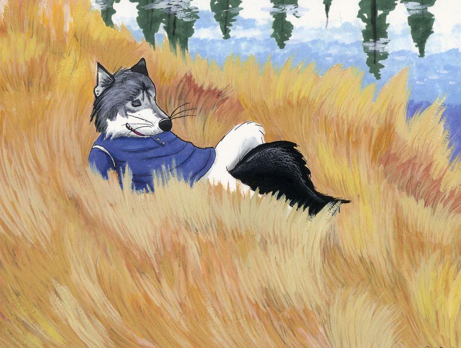 A very Van Gogh-like feel to the wheat/grass here. Lovely contrast to the more specific coloration and drawing of the character himself.