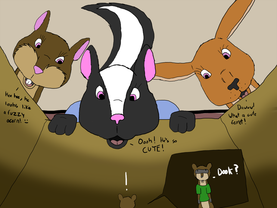Seems Illas was caught by the three giantesses. Miku, Silva, and Skittles look at him with giggles as the tiny ferret can only give a tiny "dook?"