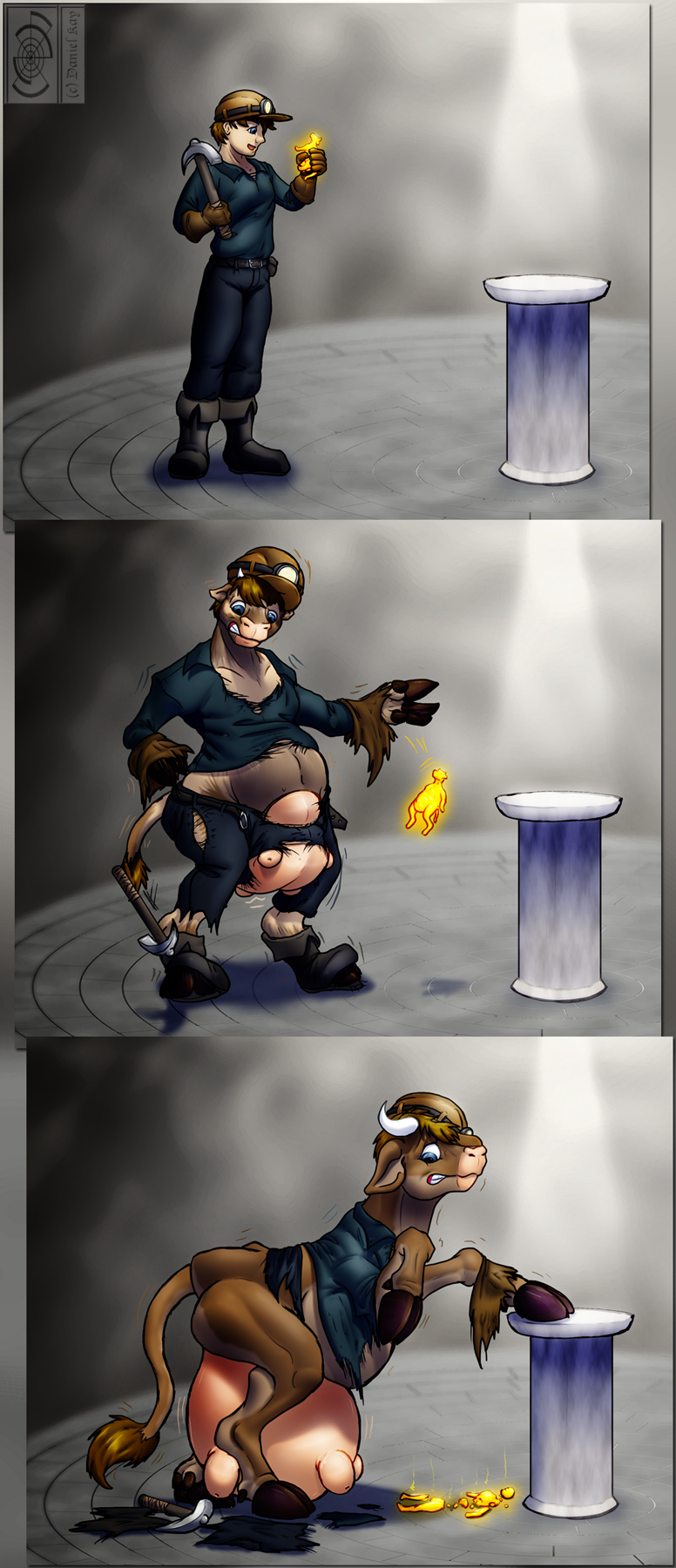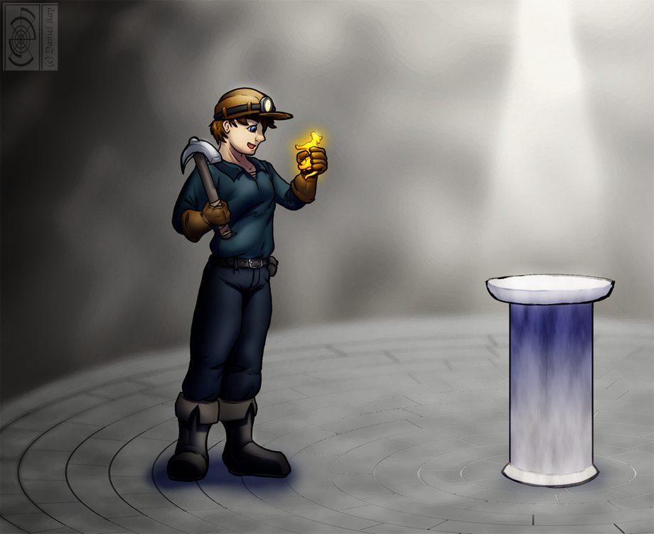 Digging deep in the mines he found an odd room with a pedestal in the middle illuminated by a strange light. On top a golden shimmering figurine of a cow.