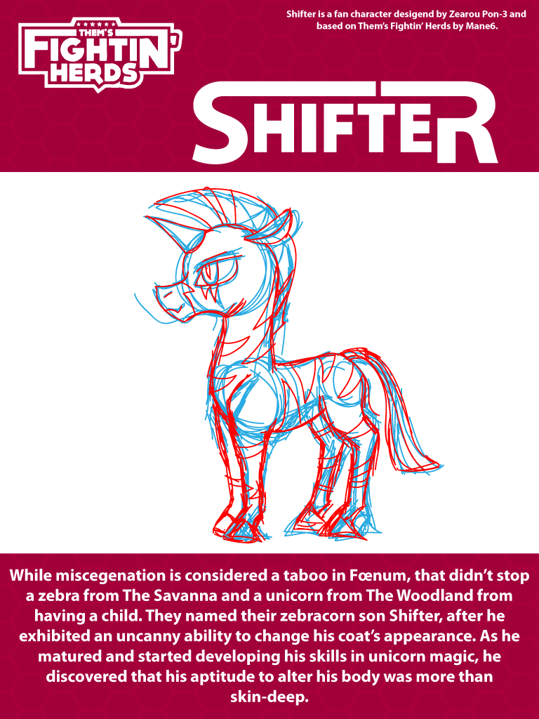 While miscegenation is considered taboo in several Foenum nations, this didn’t stop a zebra from The Savanna and a unicorn from The Woodland from having a child. They named their zebracorn son Shifter, after he exhibited an uncanny ability to change his coat’s appearance. As he grew from foal to young stallion, he turned out to be a rather rebellious and devious maverick, but nonetheless loved his parents and harbored an appreciation for his mixed heritage despite being somewhat of a social outcast.