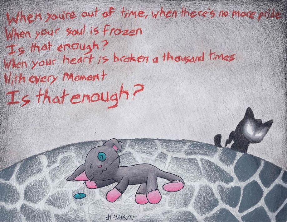 Inspired by Disturbed’s “Enough,” which can be heard here. BTW, I may or may not have gotten a few of the lyrics wrong. I’ve read the lyrics from several different sources and seen at least 4 different sets of lyrics for this one song, so I have no idea which one’s right. Your guess is as good as mine. BUT HOLY FUH DO I LOVE THAT SONG Also “The Night” was part of the inspiration behind this, but not enough for me to link you to it. GO FIND IT BY YOURSELF YOU LAZY.