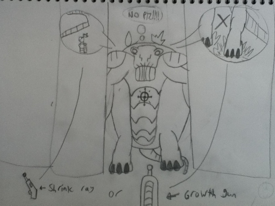The answering picture is based on your choice and comment why that choice. Humungousaur was chasing some bad guys and accidentally got stuck between 2 buildings. The bad guys got a shrink ray and a growth gun and they don't know which one to use. They need your opinion for an option.