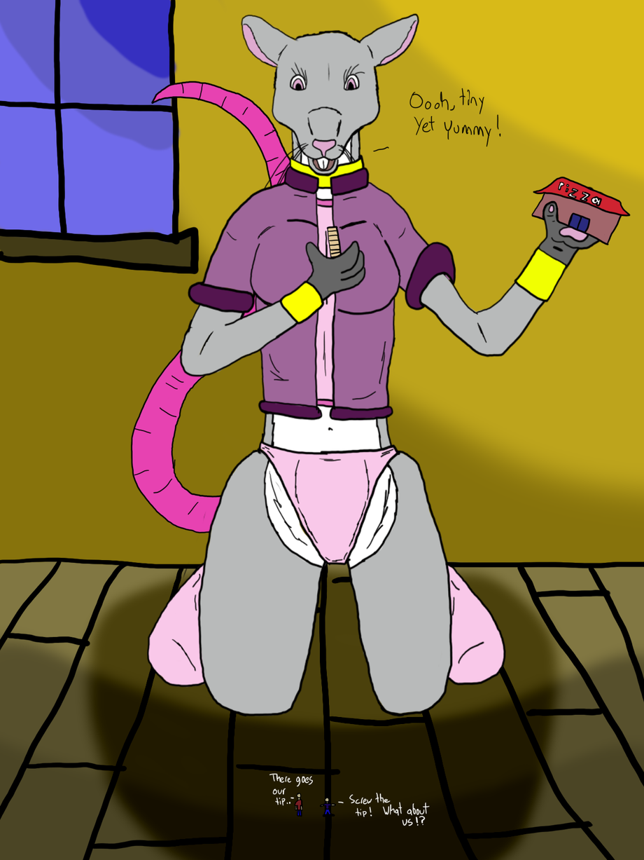 Those two pizza guys look like mice to the rat, but I think she only wants the pizza.