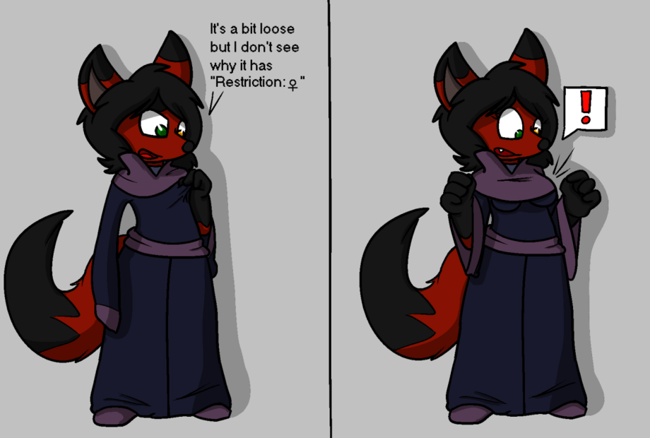 Some games put gender restrictions on outfits and that's lame. Also, I've noticed a lot of MMOs that will have gear that won't have gender restrictions, but will magically change to "suit" the gender that wears it. That is to say, full plate magically becomes a platekini when a girl puts it on.