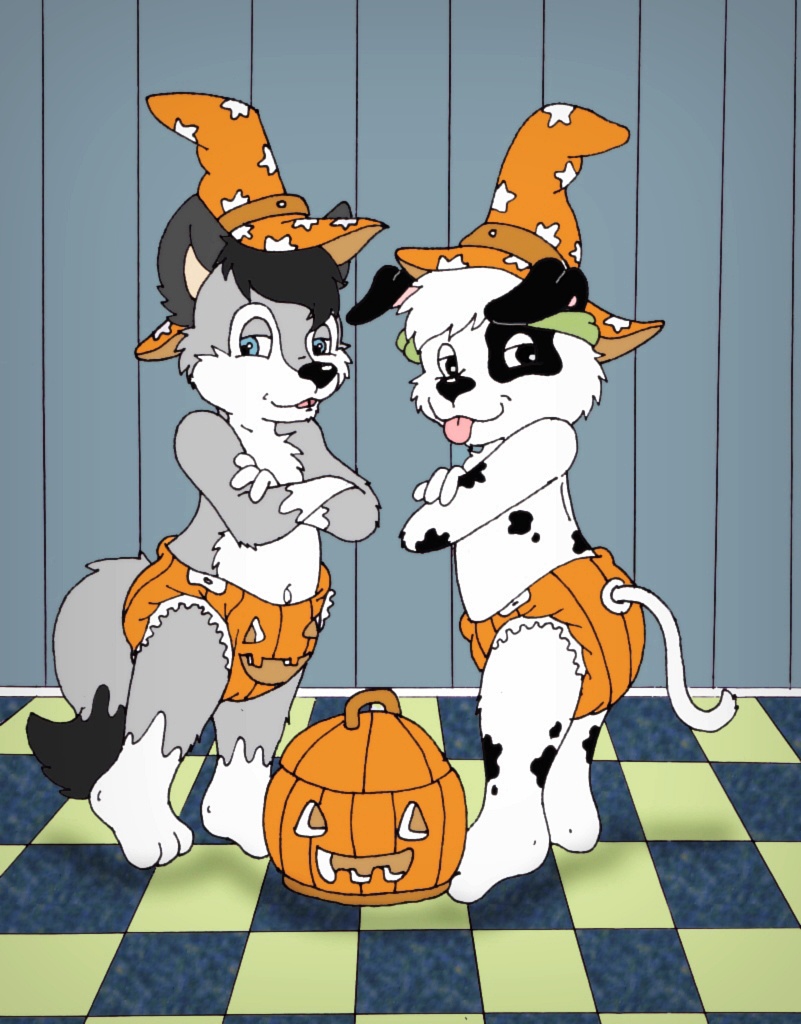 What a cute couple of "Halloween pups" they are. They're looks adorb on their pumpkins diapers. The cutetst Halloween themed picture I've seen, nice job Nelson88/Victor. ^=^