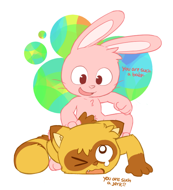 Raccoon: You better get off of me or else! I brought backup! Rabbit: Ooooh, I'm so scared! This pla