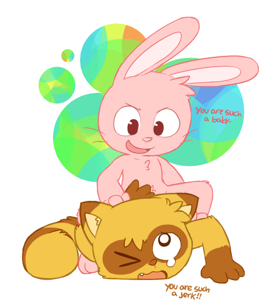 Raccoon: You better get off of me or else! I brought backup! Rabbit: Ooooh, I'm so scared! This pla