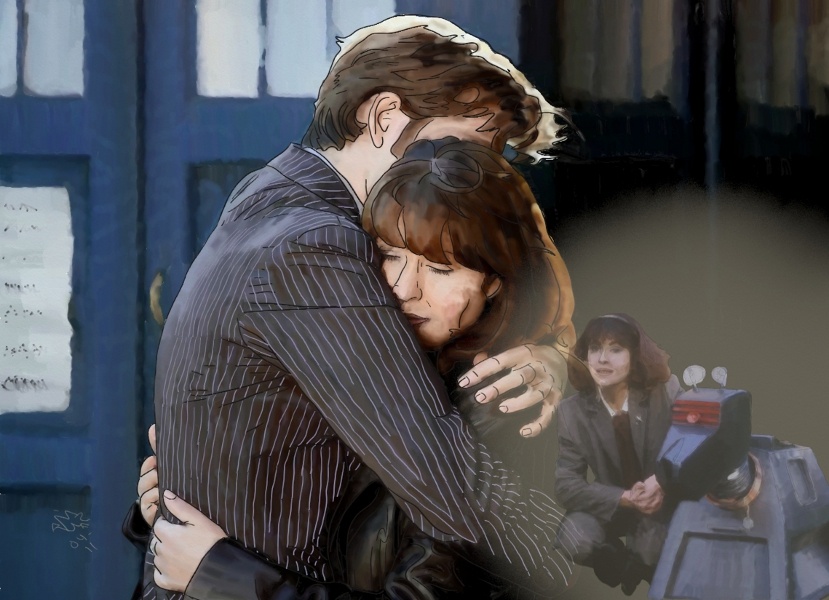 14 hours, 7 layers, using the watercolour brush in ArtRage. It's a fan painting of Elisabeth Sladen (Sarah Jane Smith), of Doctor Who fame. Ms. Sladen passed away the 19th April, 2011 from cancer; she was 63. I love the programme, so figured that I would do something in memory of such a wonderful actress. The two pictures are (inset) Sarah Jane Smith with K-9 (during the 70's run of Doctor Who) and (main) The Doctor (David Tennant) and Sarah Jane Smith saying a fond farewell. I used photos from the BBC website as references.